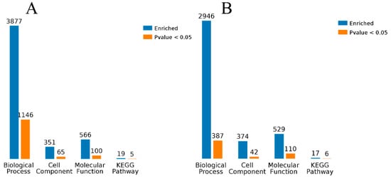 Biological process, cellular component, molecular function and KEGG pathway are the four enrichment categories that were used for the functional analysis of DEGs from the MCB vs. CON groups (A) and the MCB vs. ANT groups (B), respectively. Blue bars: Counts for each category represent the total associated terms in the database with the query gene/protein list. Orange bars: Terms with p-value < 0.05 is statistically significant.