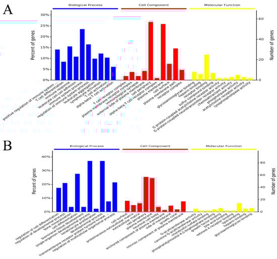 The top ten enriched terms of DEGs in each main category (Biologic Process, Cell Component, and Molecular Function) of the GO database. The right y-axis represents the number of genes involved in each GO annotation, and the left y-axis represents the percent of annotated genes in each term to the total number of DEGs. (A) Enriched terms based on DEGs between the MCB and CON groups. (B) Enriched terms based on DEGs between the MCB and ANT groups.