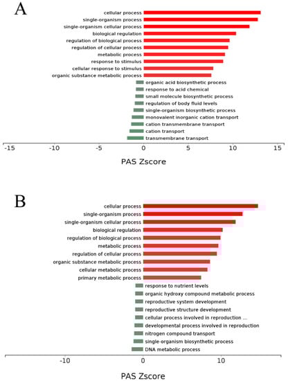 PAS value of primary enriched GO processes of DEGs using the OmicsBean system. (A) Based on the DEGs between the MCB and CON groups. (B) Based on the DEGs between the MCB and CON groups. Differentially enriched GO processes were identified according to their reporter score from the Z-score of individual genes. A reporter score of Z = 1.96 or Z = −1.96 was used as a detection threshold for significantly different processes.