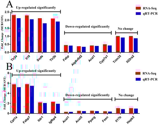 To confirm the accuracy of the RNA-seq transcriptome data, we randomly selected ten genes between the MCB and CON groups and ten genes between the MCB and ANT groups—each ten genes including four significantly up-regulated genes, four significantly down-regulated genes, and two genes with no significant differential expression. The expression levels of the selected genes were quantified using qRT-PCR, and the results were consistent with the transcriptome results (Figure 8). The results suggest that RNA-Seq reliably identified the DEGs in the duck’s liver transcriptome.
