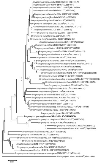 The following are available online at https://www.mdpi.com/2076-2607/7/9/360/s1, Figure S1: Maximum-likelihood tree showing the phylogenetic position of strain NEAU-SSA 1T (1412 bp) and the related species based on 16S rRNA gene sequences. The out-group used was Kitasatospora setae LM-6054T. Only bootstrap values above 50% (percentages of 1000 replications) are indicated. Bar, 0.01 nucleotide substitutions per site. Figure S2: Maximum-likelihood tree based on MLSA analysis of the concatenated partial sequences from five housekeeping genes (atpD, gyrB, recA, rpoB, and trpB) of isolate NEAU-SSA 1T and related taxa. Only bootstrap values above 50% (percentages of 1000 replications) are indicated. Kitasatospora setae LM-6054T was used as an out-group. Bar, 0.05 nucleotide substitutions per site. Table S1. Growth and cultural characteristics of strain NEAU-SSA 1T. Table S2: MLAS distance values for selected strains in this study. Table S3: General features of the genome sequence of the type strain NEAU-SSA 1T.