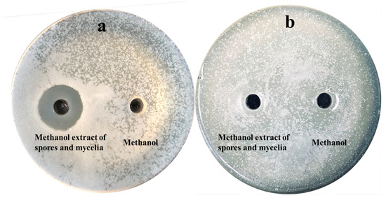 The antibacterial activity of the extract of the supernatant (a) and cell pellet of strain NEAU-SSA 1T (b) against Ralstonia solanacearum.
