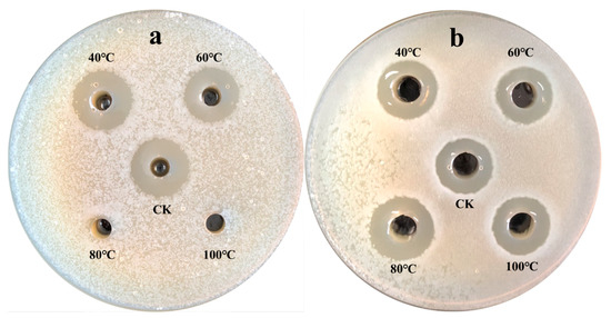 The effect of temperature on the antibacterial activity of the extract of the supernatant (a) and cell pellet of strain NEAU-SSA 1T (b) against Ralstonia solanacearum.