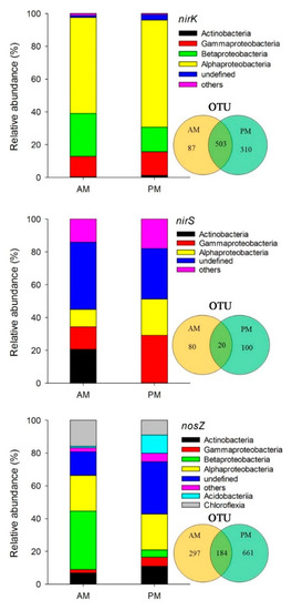 3.2. Abundance, Diversity, and Composition of Denitrifying Bacterial Communities