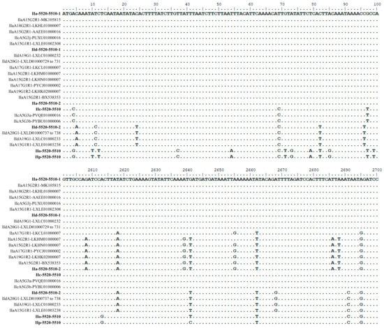 We attempted to obtain sequences of the full or near full cgd6_5520-5510 gene by sequencing TA-cloned PCR products. This led to the acquisition of the near complete cgd6_5520-5510 gene from IIc, IIo, and IIp subtypes. Surprisingly, only one type of cgd6_5520-5510 sequence was obtained from repeated sequencing of clones from the IIa or IId subtype. We obtained a total of 20 positive clones of the IIa-5520-5510-2 copy and 25 positive clones of the IId-5520-5510-1 copy from three individual experiments of TA cloning (Figure S1, Table S1, and Table S2). For the IIa subtype, the sequence (IIa-5520-5510-2) obtained had 39 nucleotide differences and a 3 bp insertion compared with the cgd6_5520-5510 sequence MK105815 (IIa-5520-5510-1) we previously obtained from the same IIa isolate [12]. Twenty-seven of these nucleotide substitutions occurred at the same positions of the ~818 bp fragment from the 3′ end of the cgd6_5520-5510 gene analyzed above, indicating the presence of two copies of the cgd6_5520-5510 gene in the IIa genome.