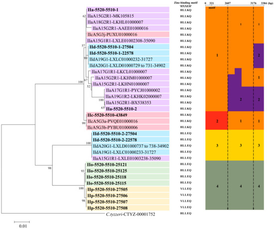 Eighteen of these NCBI sequences are near full-length, thus were used in the alignment and phylogenetic analyses. In an alignment of these sequences and the 15 sequences of the cgd6_5520-5510 gene from the present study, there were four major sequence types in the region of nucleotides 1 to 2607. Within the last 777 bp (nucleotides 2608 to 3384 in the alignment) of the gene, there were a total of 40 nucleotide substitutions, with mosaic distribution of the nucleotide substitutions among subtypes. Some of the 33 sequences were identical in the first 2607 bp, but were divergent in the remaining part of the gene (Figure 3 and Figure 4). For instance, nucleotide substitutions were detected in LKCL01000007.1, LKHM01000007.1, LKHN01000007.1, PYCJ01000002.1, LKHK02000007.1, BX538353.1, and IIa-5520-5510-2 sequences (all from IIa isolates) at positions 2618, 2662, and 2695 of the alignment. In contrast, IIc-5520-5510 has a sequence identical to IIa-5520-5510-1 and IId-5520-5510-1 in this region, despite having divergent sequences from them in the first 2607 bp, indicating the presence of mosaic sequence patterns (Figure 3 and Figure 4). The domain structure analysis revealed that all the proteins encoded by the cgd6_5520-5510 gene had only two of the four domains in classic insulinases, and had the ‘HLLKQ’, ‘HLLEQ’, or ‘YLLEQ’ sequences instead of the Zn2+-binding motif ‘HXXEH’ in the active domain of insulinases (Figure 4 and Figure S4).