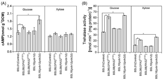 Amounts of cAMP (A) and trehalase activity (B) of recombinant S. cerevisiae strains. Cells with an initial OD600 of 1.0 were cultured at 30 °C in shake flasks at 200 rpm. Cells were sampled at mid-exponential growth phase, specifically at 12, 12.5, and 13 h of xylose fermentation; and at 4.5, 5, and 5.5 h of glucose fermentation. At each time point, three samples were taken, one from each of the triplicate fermentations. Data are mean values ± standard deviations of the three samples collected per time point. * p value < 0.05.