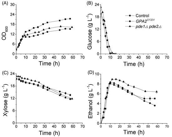 In the co-fermentation of 20 g L−1 glucose and 20 g L−1 xylose as carbon sources, the μ of strains were also similar (Figure 4). However, BSL06(GPA2G132V) and BSL16(pde1Δpde2Δ) shifted out of the exponential growth phase before BSL01′s shift. Correspondingly, biomass yields of BSL06(GPA2G132V) and BSL16(pde1Δpde2Δ) were lower than biomass of BSL01. Interestingly, the lower biomass yields did not result in lower consumption rates of sugars; in fact, sugar metabolism rates of the mutant strains were greater than the rate of the wild type. Compared to BSL01, the specific glucose consumption rate (rglucose) of BSL06(GPA2G132V) increased by 11.1%; rxylose of BSL16(pde1Δpde2Δ) increased by 48%; and rethanol of BSL06(GPA2G132V) and BSL16(pde1Δpde2Δ) increased by 14% and 22%, respectively (Figure 4, Table 2).