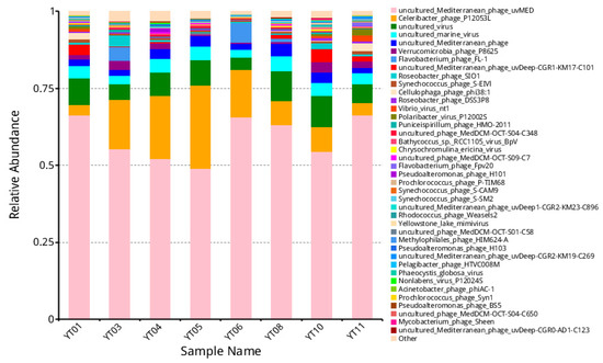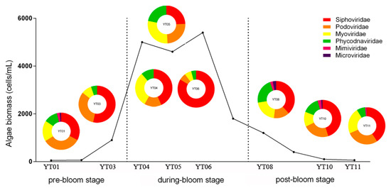 The most abundant viral communities were double-stranded DNA (dsDNA) viruses (73.08%), with a relatively lower proportion (<1%) of ssDNA and RNA virus communities. Most of the dsDNA groups of viruses were bacteriophages, which reflects the high abundance and diversity of bacterial hosts during the algal bloom. In addition, the most dominant dsDNA viruses were from the order Caudovirales. Previous viral metagenome studies on marine environments have also found a high abundance of Caudovirales [53,54]. Our analysis indicated that the relative abundance of Caudovirales increased from the pre-bloom stage (YT1 and YT3) to the growth and peak stages (YT4 to YT6); it reached its highest values at YT5 (50.6%) and subsequently decreased during the post-bloom stage (YT8, YT10, and YT11) (Figure 1). This trend suggests that the relative abundance of Caudovirales has distinct alterations in different algal bloom stages. In addition, Caudovirales has been reported to infect a wide range of bacterial hosts, especially species in the Proteobacteria and Bacteroidetes phyla, which are dominant taxa in blooms [51]. Bacterioplankton are important microbial components of food-web fluxes [39], and they have been associated with natural plankton populations [55]. Therefore, it is possible that Caudovirales potentially or indirectly affects the structure of the plankton community during blooms.