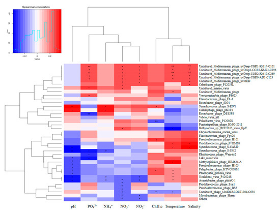 Correlation analysis between relative abundances of main viral species and environmental parameters based on Pearson correlations. The r-values indicate the correlation values of Pearson correlations. The P values indicate the statistical significance levels (single* p < 0.05 and double ** p < 0.01).