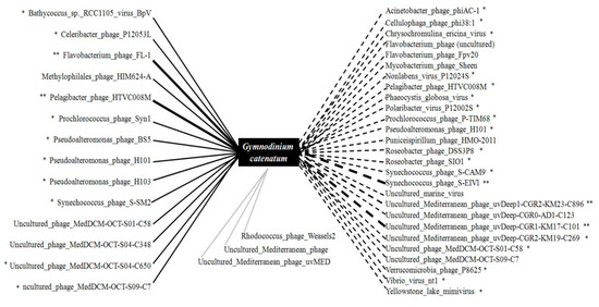 Correlation analysis of the relationship between the representative virus and the target algae G. catenatum. There was a total of forty-four correlations (fourteen positive, twenty-seven negative, and three unconnected). The solid lines indicate positive correlations, and bold solid lines indicate strong, negative correlations. The dotted lines indicate negative associations, and the bold dotted lines indicate strong negative associations. The grey solid lines indicate unlinked relationships. The statistical significance levels are * p < 0.05 and ** p < 0.01.