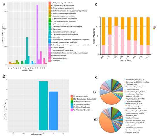 Overview of functional annotation algal bloom sample viromes. (a) Composition of predicted functional genes of sample viromes. (b) Annotation of viral carbohydrate-metabolism-related ORFs in the CAZy database. (c) Relative abundance of GH and GT in different algal bloom samples. (d) The relative contributions of viral species to GH and GT genes.