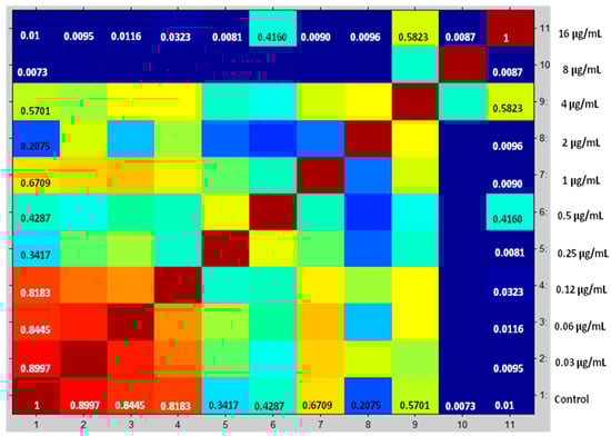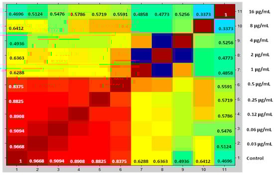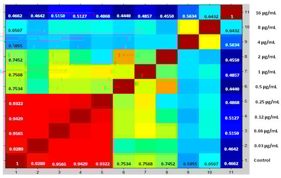 After correlation of every spectrum obtained after exposure to the concentrations 0.03–8 µg/mL with one of the two extreme concentrations, 16 (maximum) or 0 (null), the derived CCI matrixes and their respective heat map for all yeasts of the Candida parapsilosis complex were generated. These results were expressed in tables for each echinocandin tested (data not entirely shown). For example, we displayed the results for Candida parapsilosis sensu stricto 31, which was classified for both methods as susceptible. The CCI matrix, their heat map, and spectra subset are presented, respectively, in Table 2, Figure 1 and Figure 2 for caspofungin; Table 3, Figure 3 and Figure 4 for anidulafungin; and Table 4, Figure 5 and Figure 6 for micafungin.