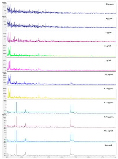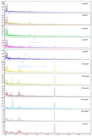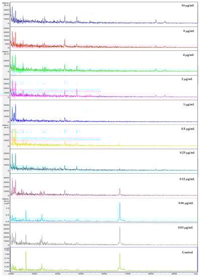 MALDI-TOF spectra profiles obtained from Candida parapsilosis 31 under ten different concentrations of micafungin and control (no drug) after exposure of 3 h at 37 °C. Minimal spectra alterations are visible following exposure to 0.25 µg/mL. Source: MALDI FlexAnalysis™ (Bruker Daltonics, Bremem, Germany).