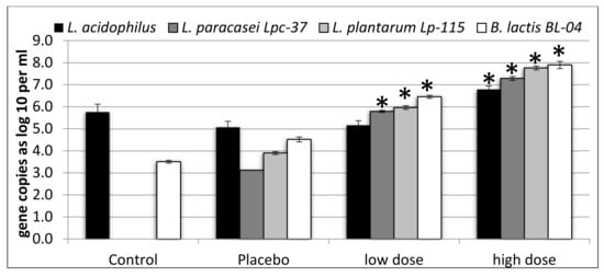 Gene copies of Lactobacillus acidophilus, Lactobacillus paracasei Lpc-37, Lactobacillus plantarum Lp-115, and Bifidobacterium lactis Bl-04 per mL of colonic simulation liquid. Results are expressed as mean and standard error of mean from four simulations, each simulation with fecal material from a different donor. Asterisks (*) indicate statistically significant (p < 0.05) differences, as compared with both the control and the placebo.