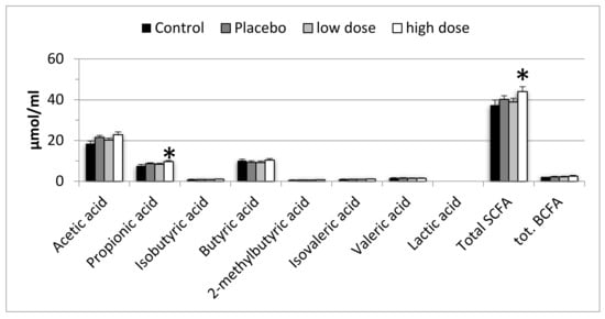 Short chain fatty acids (SCFA) and branched chain fatty acids (BCFA). Results are expressed as mean and standard error of mean from four simulations, each simulation with fecal material from a different donor. Asterisks (*) indicate statistically significant (p < 0.05) differences, as compared with both the control and the placebo.