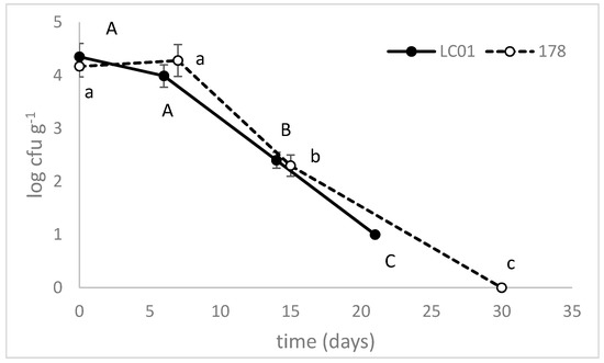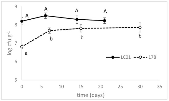 Lactic acid bacteria (LAB) counts, during the ripening of traditional sausages inoculated with Lb. casei LC01 or Lb. plantarum 178. Mean ± standard deviation. The letters indicate statistically significant differences throughout time (one-way ANOVA and Tukey’s test, p < 0.05): small letters, sausages inoculated with Lb. plantarum 178; capital letters, LC01.