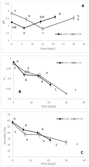 Figure 6 shows pH, humidity, and aw. The pH of both LC01 and 178-sausages showed the typical trend of sausage fermentation (salame nostrano and soppressata molisana) [20,21,23] with an initial decrease, followed by an increase to 5.5–5.6 (Figure 6A)—aw also followed a typical trend, with a final value of 0.82 for 178-sausages and 0.87 for LC01-sausages at the end of fermentation (Figure 6B). In general, the final pH of the fermented sausages in several countries was highly variable, with an average value of approximately 5.0 [25,26,27,28,29].
