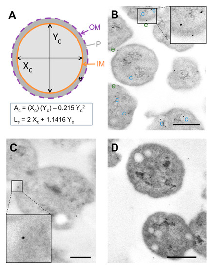 To facilitate relative labeling-pattern comparisons, subcellular gold particle distributions were standardized to dimensions of a “typical” bacterial section, calculated for each P. salmonis strain. Two measurements were taken in each bacterial cell section (Figure 1A), and the number of gold particles quantified in those sections was assigned to one of the following cellular compartments: cytoplasm, cell envelope (comprising the inner/outer membrane and periplasm), and extracellular surface. Gold particles not touching the inner membrane (IM) from the cytoplasm side were counted as part of the cytoplasmic compartment, whereas those touching the cytoplasmic membrane from either the cytoplasm or periplasm were counted as pertaining to the cell envelope. Gold particles touching the outer membrane from the periplasm were counted as belonging to the cell envelope. Particles on or touching (from the outside) the outer membrane were counted as part of the extracellular space (surface exposed). Given that primary and secondary antibody-gold conjugates may span some 20 nm, particles located on the extracellular surface that were not in contact with the outer membrane, but at a distance of ≤2 gold particle diameters, were still counted as part of the cell envelope.