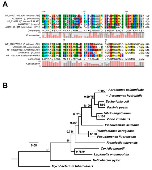 Multiple sequence alignments were performed with the Clustal Omega tool [] (v1.2.1). Protein sequence identity and similarity calculations were carried out using the MatGAT v2.0.2 tool []. The Hsp60 sequences from several bacteria (Genbank Acc. AAV80377—P. salmonis; CAA67358—Francisella tularensis; KER64311—Aeromonas hydrophila; KFN17454—Aeromonas salmonicida; AAG48876—Vibrio vulnificus; ACA58291—Vibrio anguillarum; KKM58231—Yersinia pestis; AAL55999—Escherichia coli; AEV64537—Pseudomonas fluorescens; AAB34346—Pseudomonas aeruginosa; AQL11108—Legionella pneumophila; ATN80743—Coxiella burnetii; AIH51208—Mycobacterium tuberculosis; ANH47662—Helicobacter pylori) were aligned with the Clustal Omega tool [] (v1.2.1) and trimmed manually by deleting gaps in the alignments. The set of sequences was then analyzed using PhyML v3 [] with a LG+I+G+F (Le-Gascuel + invariant + gamma + frequency-empirical) model and 1000 bootstrap replications. Bayesian inference analysis was computed using MrBayes software (v3.2.6) [] under a LG+I+G+F substitution model for 105 generations, burn-in 25%. Amino acid sequences were also analyzed with the T3S effector prediction programs SIEVE [], pEffect [], EffectiveT3 [] and ModLab T3S [], as well as the T4S effector prediction programs T4SEpre [] and T4 EffPred [], and the T6SS predictor tools Bastion6 [] and SecReT6 []. Amino acid sequences for L. pneumophila VipE, Salmonella enterica SopE and Legionella londiniensis Hcp were used as positive controls for the T3SS, T4SS, and T6SS effector predictors, respectively.