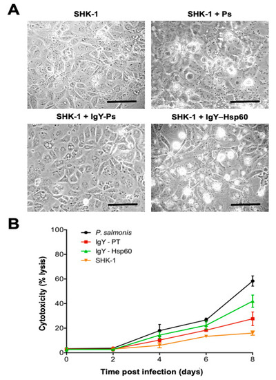 IgY anti-Hsp60 inhibitory activity was assessed []. Briefly, SHK-1 cells (1 × 105/well) were seeded onto poly-L-lysine-coated coverslips on 24-well plates containing L-15 supplemented with 2% fetal bovine serum and then cultivated to 80–90% confluence. For assays, monolayers of adherent SHK-1 cells were pre-incubated for 1 h with IgY against P. salmonis Hsp60 (1 µg/µL) and then infected for 3 h with exponential growth-phase P. salmonis AUSTRAL-005 (MOI 20). After this period, SHK-1 cells were washed twice with PBS, and the culture medium was replaced with L-15 containing 2% heat-inactivated fetal bovine serum. Controls included (i) cells treated with IgY purified from eggs of non-immunized hens; (ii) cells treated with an irrelevant IgY against fructose-1,6-bisphosphatase 1; (iii) cells without IgY treatment; and (iv) non-infected cells. Cell morphology was evaluated by inverted microscopy for up to eight days post-infection. Additionally, levels of the cytosolic enzyme LDH released into the supernatant were determined using the LDH cytotoxicity detection kit (Takara Bio Inc.) following manufacturer recommendations. Cytotoxicity (%) was calculated by simultaneously running a 100% LDH control of SHK-1 cells lysed with Triton X-100.