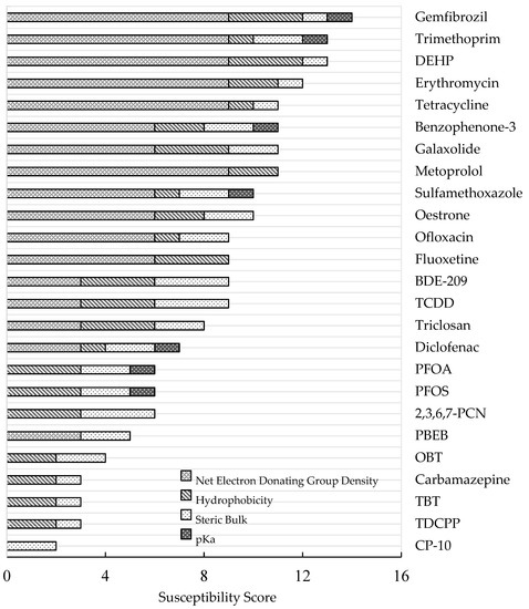 From a possible total susceptibility score of 16, Gemfibrozil, a lipid regulating pharmaceutical, scored the highest (14/16), whilst CP-10, which is a short-chained halogenated paraffin/polychlorinated naphthalene, scored the lowest (2/16). The ten most susceptible contaminants comprised four non-halogenated antibiotics (trimethoprim, erythromycin, tetracycline, and sulfamethoxazole), five non-halogenated pharmaceuticals/personal care products (gemfibrozil, metoprolol, benzophenone-3, galaxolide, and oestrone), and one non-halogenated plasticiser (DEHP). Conversely, the fifteen least susceptible contaminants comprised two halogenated surfactants (PFOA, PFOS), four halogenated flame retardants (PBEB, TDCPP, BDE-209, and 2,3,6,7-PCN), one halogenated plasticiser (CP-10), one halogenated antibiotic (ofloxacin), three pharmaceuticals (carbamazepine, diclofenac and fluoxetine), three biocides (OBT, TBT, triclosan), and one combustion by-product (TCDD).