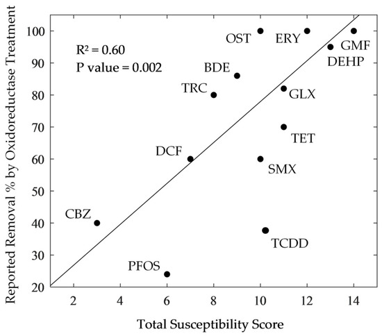 The results of the susceptibility assessment were compared with the published studies of the removal rates that were attained by various oxidoreductase treatment strategies (Figure 2). Linear regression analysis of the relationship showed that the degradation potential of a diverse range of OCs showed good agreement with the susceptibility scores for the compounds and gave an R2 = 0.60 (p value = 0.002), providing confidence in the assessment framework to predict the susceptibility of OCs to oxidoreductase degradation.