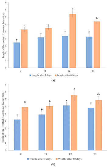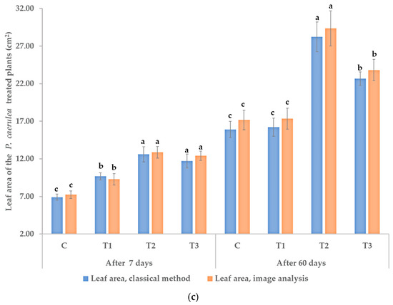 Effect of foliar treatment with plant biostimulants on the development of the leaves of P. caerulea plants after seven days from the first treatment and after 60 days from the first treatment: (a) effect on the leaf length (average of 10 leaves per replicate, four replicates per each treatment); (b) effect on the leaf width (average of 10 leaves per replicate, four replicates per each treatment); (c) effect on the average leaf area (cm2, average of 10 leaves per replicate, four replicates per each treatment). C—control (no treatment with plant biostimulants, treated only with water); T1—foliar treatment with Trichoderma consortium suspension, 106 cfu/mL, equiv. to 1011 spores/ha; T2—foliar treatment with Trichoderma consortium suspension, 108 cfu/mL, equiv. to 1013 spores/ha; T3—foliar treatment with a reference product, consisting of plant extracts, essential oils, and fatty acids in an oil/water emulsion and extract of the seaweed Ascophyllum nodosum, equiv. to 3 L/ha. The values presented represent means ± standard errors (n = 40 plants). Columns that are labeled with different letters, compared between the different treatments (C, T1, T2, and T3) within each parameter and time period (after 7 days and, respectively, after 60 days) are significantly different at p < 0.05.