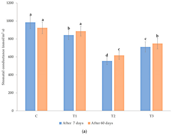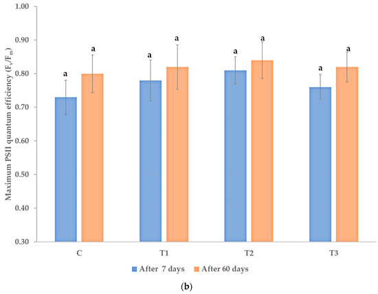 (a) Stomatal conductance (nmol/m2 s) and (b) maximum PSII quantum efficiency of P. caerulea plants after seven days from the first treatment and after 60 days from the first treatment with plant biostimulants. C—control (no treatment with plant biostimulants, treated only with water); T1—foliar treatment with Trichoderma consortium suspension, 106 cfu/mL, equiv. to 1011 spores/ha; T2—foliar treatment with Trichoderma consortium suspension, 108 cfu/mL, equiv. to 1013 spores/ha; T3—foliar treatment with the reference product, consisting of plant extracts, essential oils and fatty acids in an oil/water emulsion, and extract of the seaweed Ascophyllum nodosum, equiv. to 3 L/ha. The values presented are means ± standard error (n = 40 plants). Columns labeled with different letters, compared between the different treatments (C, T1, T2, and T3) within each time period (after 7 days and, respectively, after 60 days) are significantly different at p < 0.05.