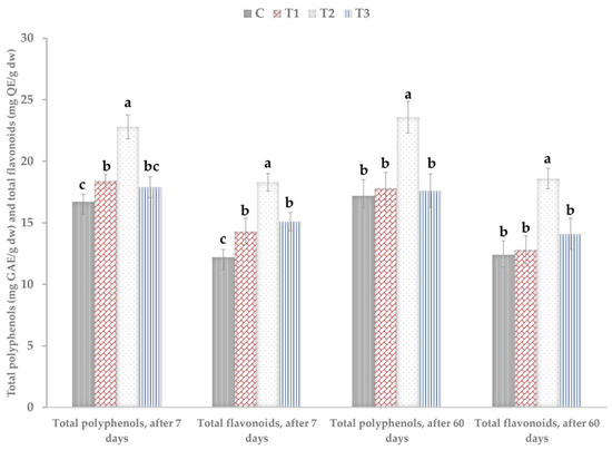 Total polyphenols (mg GAE/g dw) and total flavonoids (mg QE/g dw) in the hydroalcoholic extracts from aerial parts of the P. caerulea plants after seven days from the first treatment and after 60 days from the first treatment with plant biostimulants. C—control (no treatment with plant biostimulants, treatment only with water); T1—foliar treatment with Trichoderma consortium suspension, 106 cfu/mL, equiv. to 1011 spores/ha; T2—foliar treatment with Trichoderma consortium suspension, 108 cfu/mL, equiv. to 1013 spores/ha; T3—foliar treatment with a reference product, consisting of plant extracts, essential oils, and fatty acids in an oil/water emulsion, and extract of the seaweed Ascophyllum nodosum, equiv. to 3 L/ha. Values presented are means ± standard error (n = 12 replicates). Columns labeled with different letters within each parameter are significantly different at p < 0.05.