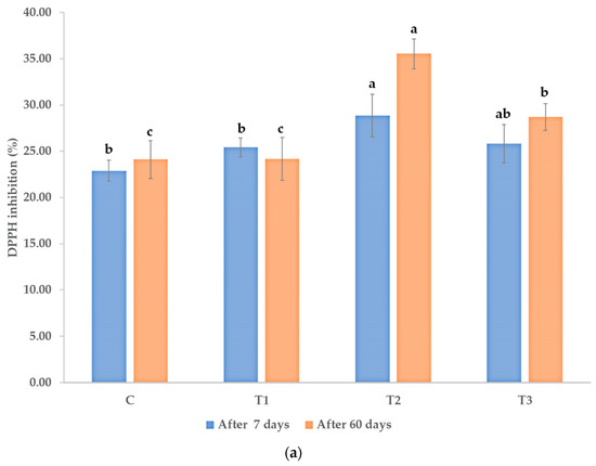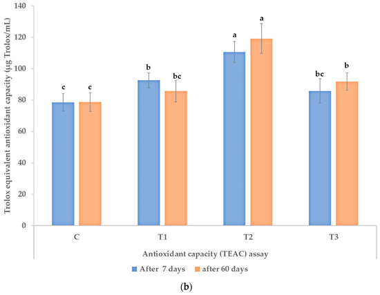 Antioxidant activity of the hydroalcoholic extract of aerial parts of the P. caerulea plants, determined as the ability to scavenge the formation of the DPPH (2,2-diphenyl-1-picryl-hydrazyl-hydrate) free radicals (a) and TEAC (Trolox equivalent antioxidant capacity) (b), after seven days from the first treatment and after 60 days from the first treatment. C—control (no treatment with plant biostimulants, treatment only with water); T1—foliar treatment with the Trichoderma consortium suspension, 106 cfu/mL, equiv. to 1011 spores/ha; T2—foliar treatment with the Trichoderma consortium suspension, 108 cfu/mL, equiv. to 1013 spores/ha; T3—foliar treatment with a reference product, consisting of plant extracts, essential oils and fatty acids in an oil/water emulsion, and extract of the seaweed Ascophyllum nodosum, equiv. to 3 L/ha. The values presented are means ± standard error (n = 12 replicates). Columns labeled with different letters, compared between the different treatments (C, T1, T2, and T3) within each time period (after 7 days and, respectively, after 60 days) are significantly different at p < 0.05.