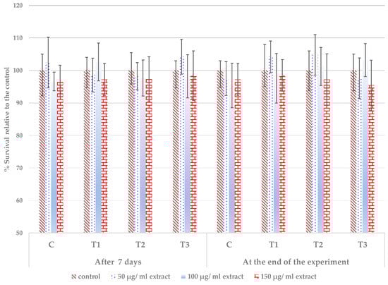 Mouse fibroblast NCTC L929 cell viability after incubation for 48 h with different concentrations of a hydroalcoholic extract of aerial parts of the P. caerulea plants sampled after seven days from the first treatment and after 60 days from the first treatment with plant biostimulants. C —plant control (no treatment with plant biostimulants, treated only with water); T1—foliar treatment with the Trichoderma consortium suspension, 106 cfu/mL, equiv. to 1011 spores/ha; T2—foliar treatment with the Trichoderma consortium suspension, 108 cfu/mL, equiv. to 1013 spores/ha; T3—foliar treatment with a reference product, consisting of plant extracts, essential oils, and fatty acids in an oil/water emulsion, and the extract of the seaweed Ascophyllum nodosum, equiv. to 3 L/ha. The values presented are means ± standard errors (n = 12 replicates) and are not statistically different.