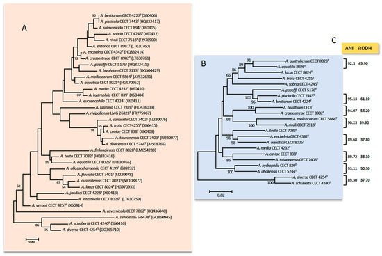 (A) Phylogenetic tree based on the sequences of the 16S rRNA gene (1498 bp) among 36 species of Aeromonas. (B) Phylogenetic tree based on the concatenated sequences of rpoD and gyrB genes (1098) among the most similar species based on the 16S rRNA gene. The number in the nodes indicates the bootstrap values substitutions estimated by site. (C) Results (%) for the ANI (average nucleotide identity) and isDDH (in silico DNA–DNA hybridization) obtained between the genomes of the most similar species; notice that ANI and isDDH values are ≤96% and ≤70% in all cases, respectively which are the cut-off values established for delimiting Aeromonas spp.