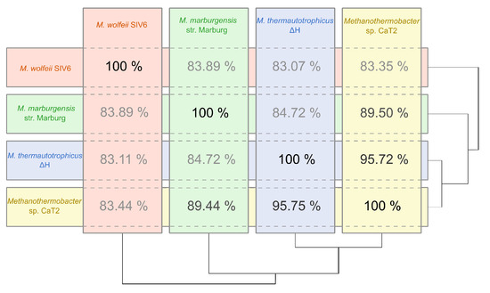 On the 16S rRNA gene level, the closest relatives of M. wolfeii SIV6 are M. thermautotrophicus, M. defluvii, M. thermoflexus, M. thermophilus and M. marburgensis. The strains M. tenebrarum and M. crinale cluster in a separate clade of the phylogenetic tree and have a larger distance to the M. wolfeii SIV6 strain. The chosen outgroup is Methanobacterium formicicum since the genus Methanobacterium is closely related to the genus Methanothermobacter. To date, three Methanothermobacter strains, namely Methanothermobacter sp. CaT2, M. thermautotrophicus H and M. marburgensis str. Marburg, were completely sequenced. ANI (average nucleotide identity) calculations for these three Archaea revealed values between 84.72% and 95.75% (Figure 3). The comparison of M. wolfeii SIV6 with the reference strains showed ANI values between 83.07% and 83.89%. Due to these results, strain SIV6 is the most distant relative on genus level. ANI values of above 95% indicate organisms belonging to the same species [42], but there is no ANI cutoff for genus level.