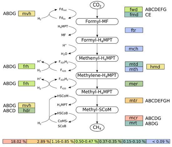 Reconstructed hydrogenotrophic methanogenesis pathway of M. wolfeii SIV6. Colors indicate the percentage of TPM (transcripts per million) values belonging to these genes or operons. Subunits of enzymes are indicated by the capital letters next to the corresponding gene designation. Abbreviations are further explained in the text.