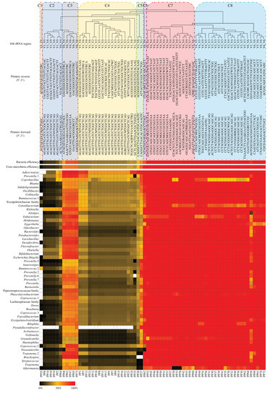 Focusing our interest on the bacterial genera, the C1, C2, and C4 clusters showed an inability to amplify Pseudoflavonifractor, while C1 and C5 presented an inability to amplify Brachyspira genus. Furthermore, C4 displayed higher efficiency (average of 76.69% ± 13.84%) for Adlercreutzia and Prevotella 1 genera compared to the other taxa (average of 35.16% ± 13.89%), indicating a probable over-estimation of these two bacterial genera. Interestingly, the C6, C7, and C8 clusters exhibited some issues in the amplification of the genus Akkermansia [26]. In detail, 14 PCR primer pairs out of 38 showed an efficiency of <90% and PP29 (336F/806R), PP33 (Bact340F/Bact806R), and PP58 (799F/1193R) were deduced to possess an amplification efficiency of <5% (average of 4.63% ± 0.81%), suggesting an underestimation of this bacterial genus.