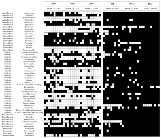 In order to verify the impact of the predicted in silico primer efficiency on the taxonomic profiles reconstructed through 16S rRNA gene-based profiling analysis, we selected a total of 60 healthy human fecal samples belonging to six public metagenomic datasets (Table S4). Prior to performing a meta-analysis, all the 60 samples were re-analyzed using 10,000 reads per dataset and the same bioinformatics pipeline based on Qiime2 [12], DADA2 for OTU generation at 100% [13] identity, and the SILVA database v.132 [15]. In detail, we selected three studies based on primer pairs with an efficiency <50%, i.e., PP5, PP14, and PP23, and three studies that used primers pairs with a predicted amplification efficiency of >90%, i.e., PP39, PP45, and PP50. Notably, all the included datasets correspond to heathy human adults living in developed countries. The meta-analysis allowed the identification of a total of 200 bacterial genera with a relative abundance of >0.5% in at least one sample, which were used for further statistics (Table S5). Interestingly, taxonomical prediction revealed that the profiles obtained from PCR primer pairs with an amplification efficiency of >90% and <50% were able to detect 39.22% ± 4.05% and 9.40% ± 5.12% of the 200 observed bacterial taxa, respectively (Table S5). Focusing on the 54 bacterial taxa commonly found in the human gut microbiota reported in a previous study [16], the meta-analysis showed that samples based on PCR primer pairs PP39, PP45, and PP50 classify 30 ± 4 genera (54.88% ± 6.50%), while samples obtained from PP5, PP14, and PP23 identify only 5 ± 4 genera (8.95% ± 6.56%; Figure 2 and Table S5). These data were also confirmed by comparison of two data sets obtained from 10 and 9 fecal samples corresponding to infants profiled with the high-efficiency PCR primer pair PP56 and the low efficiency PCR primer pair PP22, respectively (Table S5). Intriguingly, PCR primer pair PP56 allowed the detection of a total of 26 ± 10 taxa with a relative abundance >0.5%, while PCR primer pair PP22 detected just 13 ± 1 genera. Although the different DNA extraction procedures employed in these two different studies may have impacted on the number of species detected, the remarkable differences in profiling accuracy observed between high and low performance primers set confirmed that the use of a validated and tested protocol of 16S rRNA profiling is fundamental to avoid underestimation of specific bacterial genera. Moreover, these results underline the critical importance to carefully consider the applied protocols when inspecting or comparing data published in previous studies.