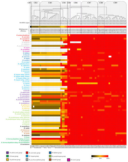 The division of the bifidobacterial species in the 10 known phylogenetic groups [27] allowed to identify a possible correlation between primer pairs and species amplification. In detail, CB1, CB2, and CB3 clusters, which are mainly represented by forward PCR primers designed to amplify the V1 region and by reverse PCR primers designed to amplify V8 and V9 regions, showed an inability to amplify several species belonging to B. psychraerophilum group, B. tissieri group, B. bifidum group, B. longum group, and B. pseudolongum group. Curiously, the CB6 cluster, characterized by PCR primers pairs that amplify 16S rRNA gene regions spanning from nucleotide 515 to nucleotide 806 and from nucleotide 338 to nucleotide 534 [28] indicated an inability to amplify B. aquikefiri, thus highlighting the importance of selection of optimal 16S rRNA gene primer pairs.