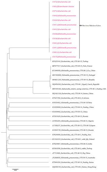 The phylogeny of CTX-M-15 was constructed using v. 1.8.1 in BioEdit v. 7.0.9.0 software. These analyses were performed with a multiple alignment matrix of obtained partial CTX-M-15 sequences and the GenBank reference sequences of human, poultry and swine from Africa (Nigeria), Asia (Japan, China and Hong Kong), Europe (France, Turkey, Poland, Russia, Switzerland, and Czech Republic), the Middle East (Iran), and South America (Brazil). Enterobacteriaceae carrying CTX-M-15 isolated from fruit bats of Makokou in Gabon (in pink color).