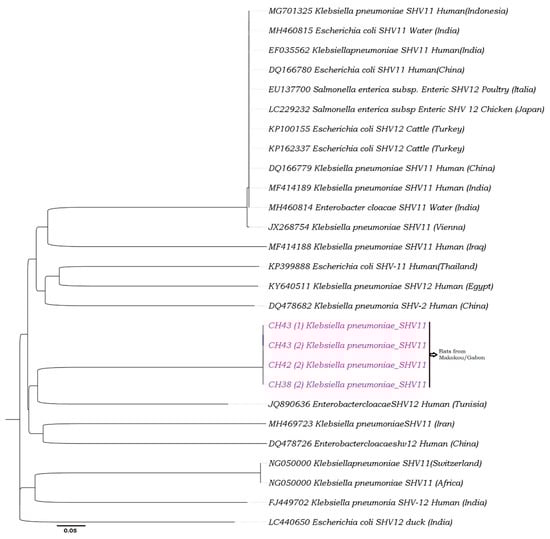 The phylogeny of SHV-11 was constructed using v. 1.8.1 in BioEdit v. 7.0.9.0 software. These analyses were performed with a multiple alignment matrix of obtained partial SHV-11 sequences and the GenBank reference sequences of human, water and cattle from Europe (Italy, Russia and Switzerland), Asia (China, Indonesia, India and Thailand), the Middle East (Iran), and Africa (Tunisia and Egypt). All sequences of SHV-11 were from K. pneumoniae from bats. Enterobacteriaceae carrying SHV-11 isolated from fruit bats of Makokou in Gabon (in pink color).