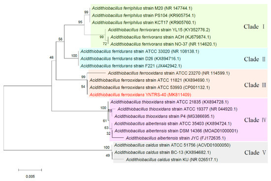 Based on 16S rRNA gene sequence analysis, it can be seen that all strains clustered separately into different clades, such as A. ferriphilus (Clade I), A. ferrivorans (Clade I), A. ferridurans (Clade II), A. ferrooxidans (Clade III), A. thiooxidans (Clade IV), A. albertensis (Clade IV), and A. caldus (Clade V). This finding was similar to a study by Zhang et al. [41] and slightly different from literature, in which A. ferridurans, A. thiooxidans, and A. albertensis clustered into the common clade [2]. The strain YNTRS-40 appeared to represent a coherent group with Acidithiobacillus ferrooxidans ATCC 11821 and Acidithiobacillus ferrooxidans ATCC 53993 (Figure 3). The 16S rRNA gene sequence similarities between the strain YNTRS-40 and the closest relative and the result of ANI analysis among A. ferrooxidans strains, including the strain YNTRS-40, are shown in Tables S3 and S4.
