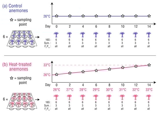 Clonal GBR origin E. diaphana (genotype = AIMS2; n = 144) harbouring their natural symbiont, B. minutum, were randomly selected from a single tank in the University of Melbourne (UoM) culture collection. Genotyping and symbiont identification for these cultures has been previously described [29]. The selected anemones were individually relocated into single wells within sterile 12-well plates (Costar 3513, Corning, NY, USA), and placed in two Hi-Point 740 incubators, each with lighting intensity and spectra matching the culture collection. The anemones were then acclimated for 10 days at 26 °C in autoclaved seawater reconstituted from Red Sea Salt™ (hereafter, ‘RSS-water’) at a salinity of 34 parts per thousand and fed freshly hatched Artemia salina nauplii once during the acclimation period. The RSS-water was changed every two days. Lighting throughout the experiment was 31.8–33.8 µmol m−2 s−1 on a 12 h:12 h light–dark cycle. Following the 10 day acclimation period, 72 (heat-treated) anemones were exposed to temperature increasing from 26 °C to 33 °C over 14 days with a programmed increase of 0.5 °C per day, and 72 (control) anemones were maintained at 26 °C (Figure 1). Throughout the experiment, each incubator’s temperature was monitored by internal sensors, an independent electronic temperature probe and data logger (Saveris T3D, Testo, Lenzkirch, Germany), and glass thermometers (Initial, Brannan, Cleator Moor, England) placed in water-filled 500 mL Schott bottles. The anemones were not fed after acclimation to minimize the introduction of bacteria that could have contributed to their bacterial compositions. Starvation was considered reasonable as it is a common practice in E. diaphana studies [21,23,30,31,32].
