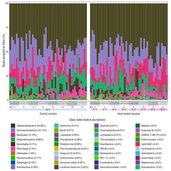 The six most abundant taxonomic classes across all samples were Alphaproteobacteria (44.95%), Gammaproteobacteria (21.12%), Bacteroidia (12.14%), Deltaproteobacteria (9.98%), Spirochaetia (4.1%) and Pla3 Lineage (3.2%), which accounted for >95% of all bacterial taxa (Figure 7). The relative abundance of most class-level bacterial taxa in control and heat-treated anemones was similar from Days 0 to 10. However, in some classes there was a divergence between the control and heat-treated anemones after Day 10, with significant increases in Alphaproteobacteria (Student’s t-test, p = 0.025) and Bacteroidia (Student’s t-test, p = 0.005), and decreases in Deltaproteobacteria (Welch’s t-test, p = 0.009) and Spirochaetia (Mann–Whitney U test, p = 0.031) in the heat-treated anemones compared to the control anemones. From Day 0 to Day 14, the control and heat-treated anemones underwent comparable decreases in Gammaproteobacteria taxa from 28.0% to 19.5%, although only the overall change in the control anemones was significant (Student’s t-test, p = 0.008), and comparable increases in Pla3 Lineage taxa from 0.6% to 5.0%, which was a significant increase in both the control (Mann–Whitney U test, p = 0.031) and heat-treated anemones (Mann–Whitney U test, p = 0.031).