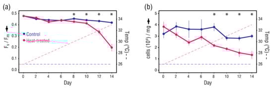 (a) Dark-adapted quantum yield (Fv/Fm) (at each datapoint, n = 6), and (b) Symbiodinaceae cell density (cells (106)/mg) (at each datapoint, n = 3). Error bars ± 1 SEM. Asterisks indicate significant differences between control and heat-treated values (Student’s t-tests, α = 0.05).