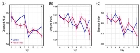 (a) Average number of observed amplicon sequence variants (ASVs), (b) Simpson index values, and (c) Shannon index values. At each datapoint, n = 6. Error bars ± 1 SEM. Asterisks indicate significant differences between control and heat-treated values (Student’s t-tests, α = 0.05).