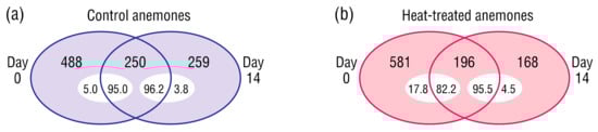 Unique and common bacterial ASVs at Day 0 and 14 in (a) control, or (b) heat-treated anemones. Inset numbers indicate relative abundance (%) on Day 0 or 14.