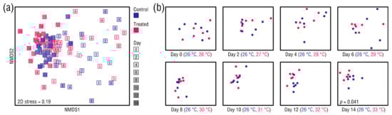 Datapoints in an nMDS ordination of the anemone microbiomes converged during the study period, indicating that the bacterial communities of the control and heat-treated anemones became more similar over time (Figure 6a). Thus, time rather than treatment was the primary grouping factor. However, as seen in plots showing the original ordination separated by day (Figure 6b), the datapoints appeared to cluster in a group-wise manner at Day 12, suggesting that the control and heat-treated anemones were developing distinct bacterial community compositions. This trend continued through to Day 14, and a GLM analysis indicated that by Day 14 the bacterial communities of the control and heat-treated anemones had become significantly different (manyGLM, p = 0.041) (Table S4).