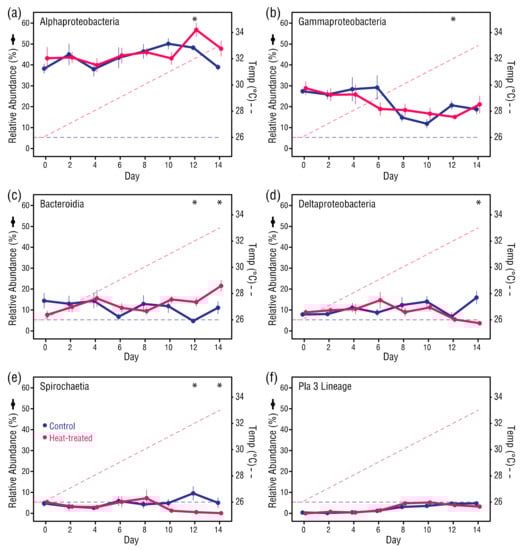 Changes in the six most abundant bacterial classes across all samples: (a) Alphaproteobacteria, (b) Gammaproteobacteria, (c) Bacteroidia, (d) Deltaproteobacteria, (e) Spirochaetia, and (f) Pla3 Lineage. For each datapoint, n = 6. Error bars ± 1SEM. Asterisks indicate significant differences between control and heat-treated values (see main text for test types, α = 0.05).
