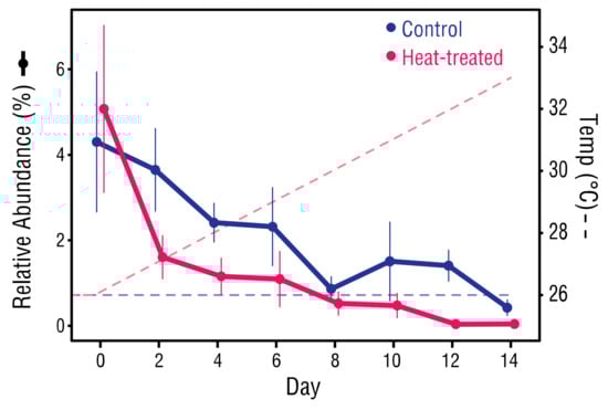 Shifts in bacterial alpha diversity in the control and heat-treated anemones were largely congruent, which could infer that heat was not, or was only partly responsible for changes in richness. The possible influence of starvation and incomplete acclimation on bleaching has been noted, with acclimation potentially playing a particular role in the initial changes seen in bacterial composition. For example, a study of corals transferred from a reef to aquaria found that the bacterial communities in the coral surface mucus layer (SML) took 14–28 days to stabilize [79]. Although the E. diaphana in the present study did not undergo such a dramatic relocation, the decline in richness among all the anemones could represent the late stages of acclimation, with the recovery in richness in the control anemones from Day 10 indicating a return to a normal state. As this return was not matched by the heat-treated anemones, it is reasonable to suggest that beyond Day 12 (i.e., above 32 °C) temperature was the main driver of change in alpha diversity for the heat-treated anemones.