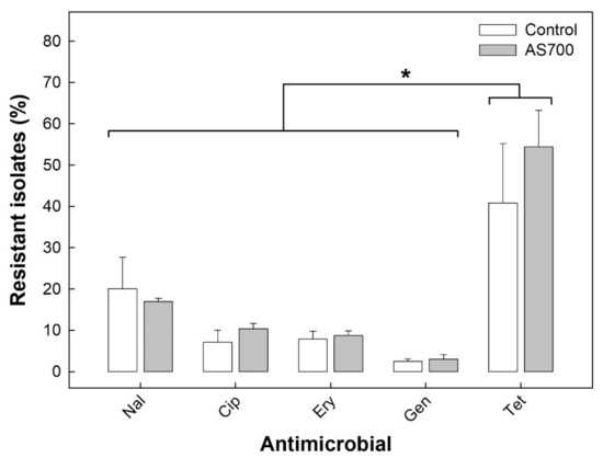 - Kalmokoff, M.; Waddington, L.M.; Thomas, M.; Liang, K.L.; Ma, C.; Topp, E.; Dandurand, U.D.; Letellier, A.; Matias, F.; Brooks, S.P. Continuous feeding of antimicrobial growth promoters to commercial swine during the growing/finishing phase does not modify faecal community erythromycin resistance or community structure. J. Appl. Microbiol. 2011, 110, 1414–1425. [Google Scholar] [CrossRef]